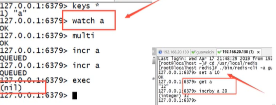 :监视一个(或多个) key, 如果在事务执行之前这个(或这些) key被其他命令所改动,那么事务将被打断。
