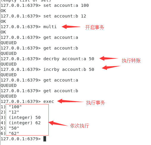2、直到输入Exec后, Redis会将之前的命令队列中的命令依次执行。