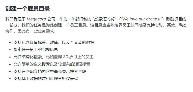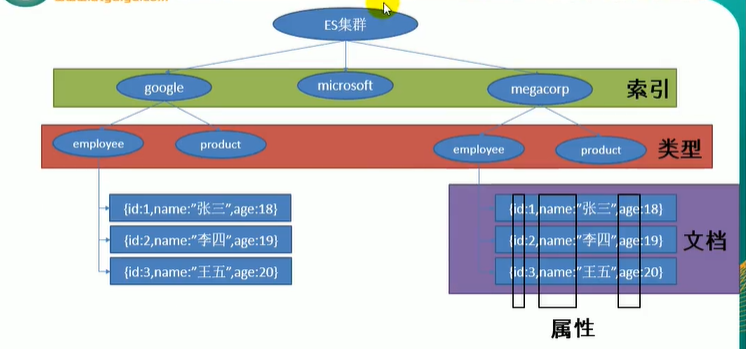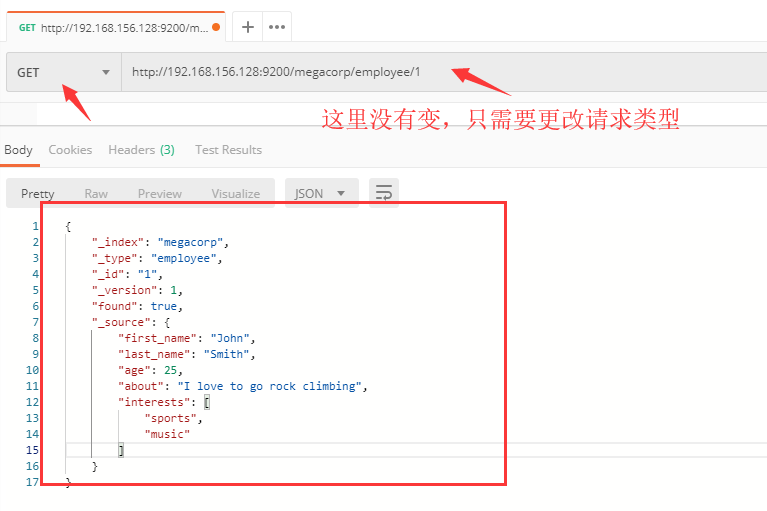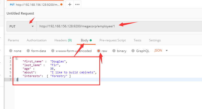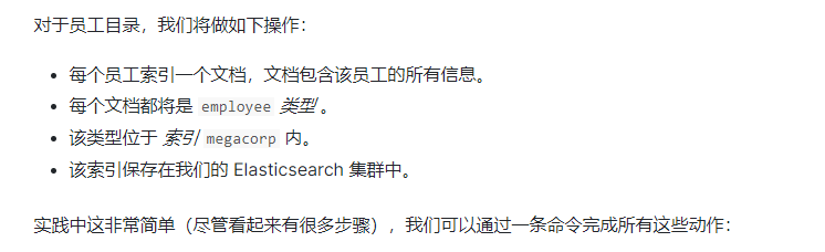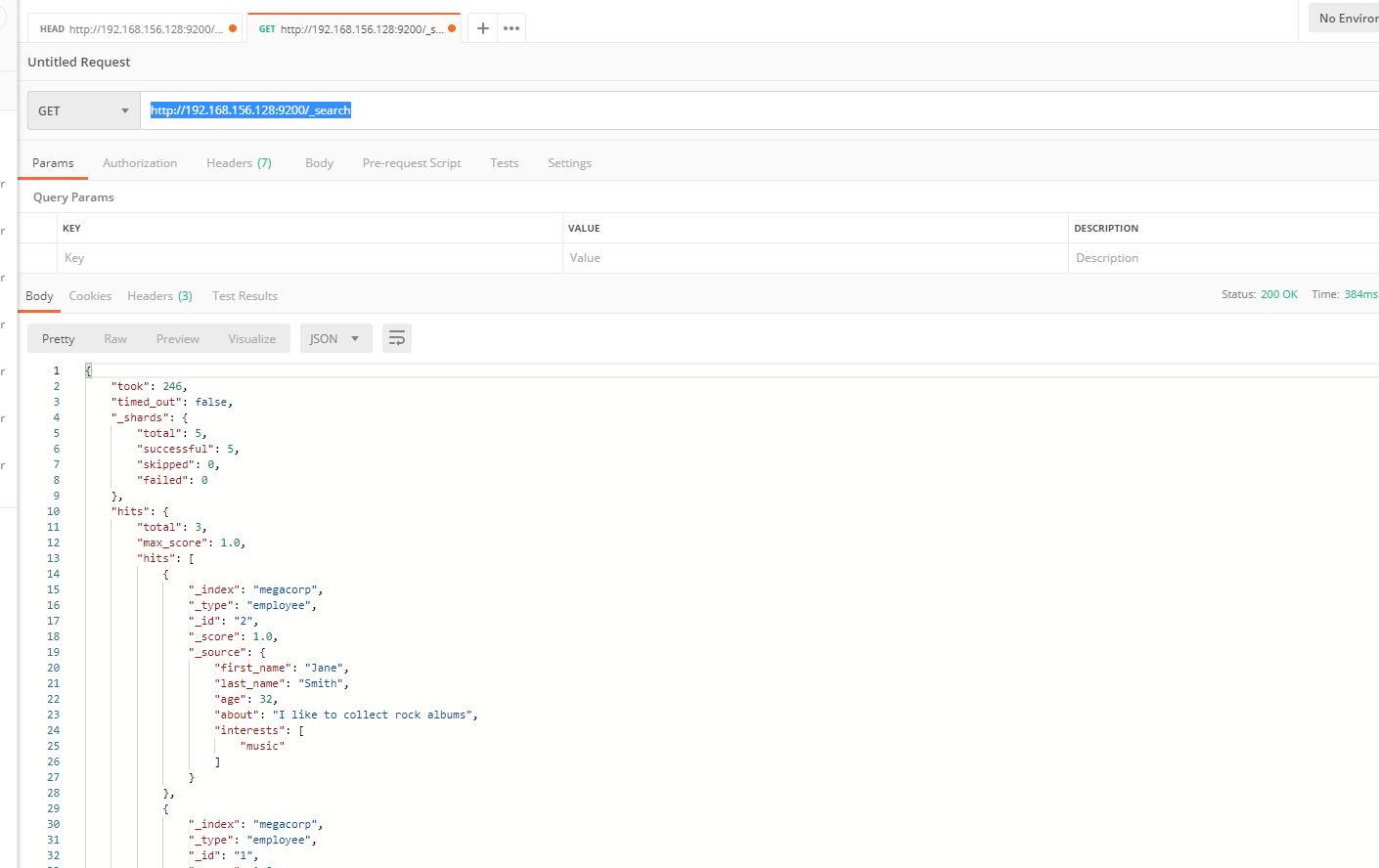 1 2 3 4 5 6 7 8 9 10 11 12 13 14 15 16 17 18 19 20 21 22 23 24 25 26 PUT /megacorp/employee/1 { "first_name" : "John" , "last_name" : "Smith" , "age" : 25 , "about" : "I love to go rock climbing" , "interests" : [ "sports" , "music" ] } PUT /megacorp/employee/2 { "first_name" : "Jane" , "last_name" : "Smith" , "age" : 32 , "about" : "I like to collect rock albums" , "interests" : [ "music" ] } PUT /megacorp/employee/3 { "first_name" : "Douglas" , "last_name" : "Fir" , "age" : 35 , "about" : "I like to build cabinets" , "interests" : [ "forestry" ] }