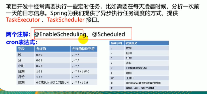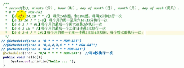1 2 3 4 5 6 7 8 9 10 11 @Service public class ScheduledService { @Scheduled (cron = "0 * * * * MON-FRI" ) public void hello () { System.out.println("hello...." ); } }