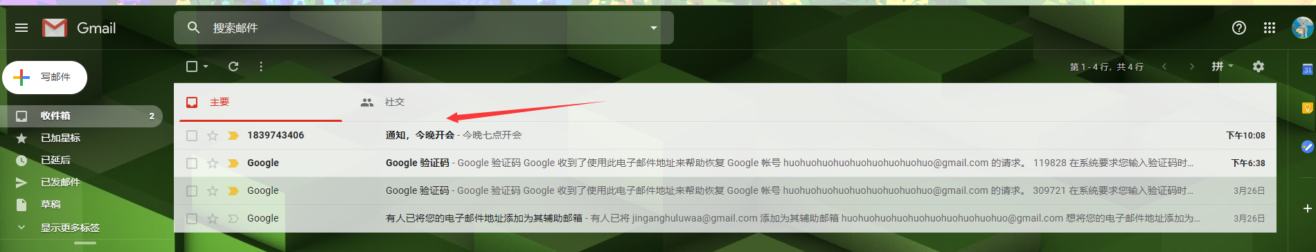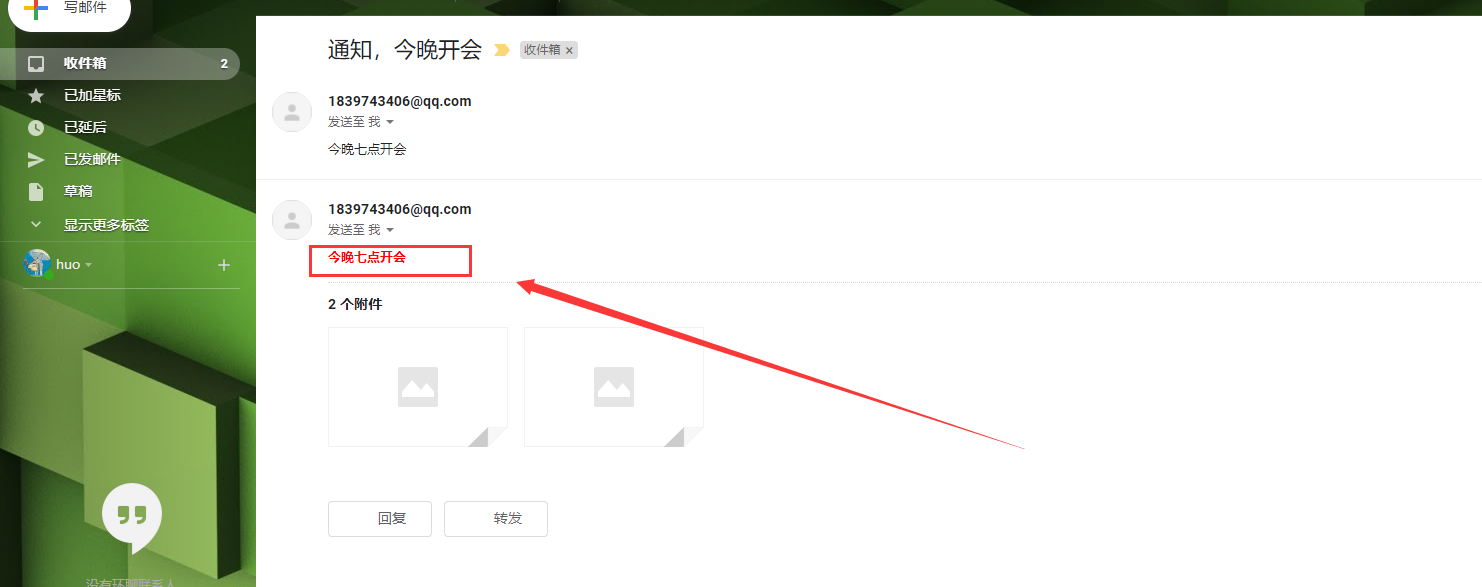 1 2 3 4 5 6 7 8 9 10 11 12 13 14 15 16 17 18 19 20 21 @Test public void t2 () throws Exception { MimeMessage mailMessage = mailSender.createMimeMessage(); MimeMessageHelper helper = new MimeMessageHelper(mailMessage,true ); helper.setSubject("通知,今晚开会" ); helper.setText("<b style='color:red'>今晚七点开会</b>" ,true ); helper.setTo("jinganghuluwaa@gmail.com" ); helper.setFrom("1839743406@qq.com" ); helper.addAttachment("1.jpg" ,new File("F:\\壁纸\\Minecraft.jpg" )); helper.addAttachment("2.jpg" ,new File("F:\\壁纸\\Minecraft2.jpg" )); mailSender.send(mailMessage); }