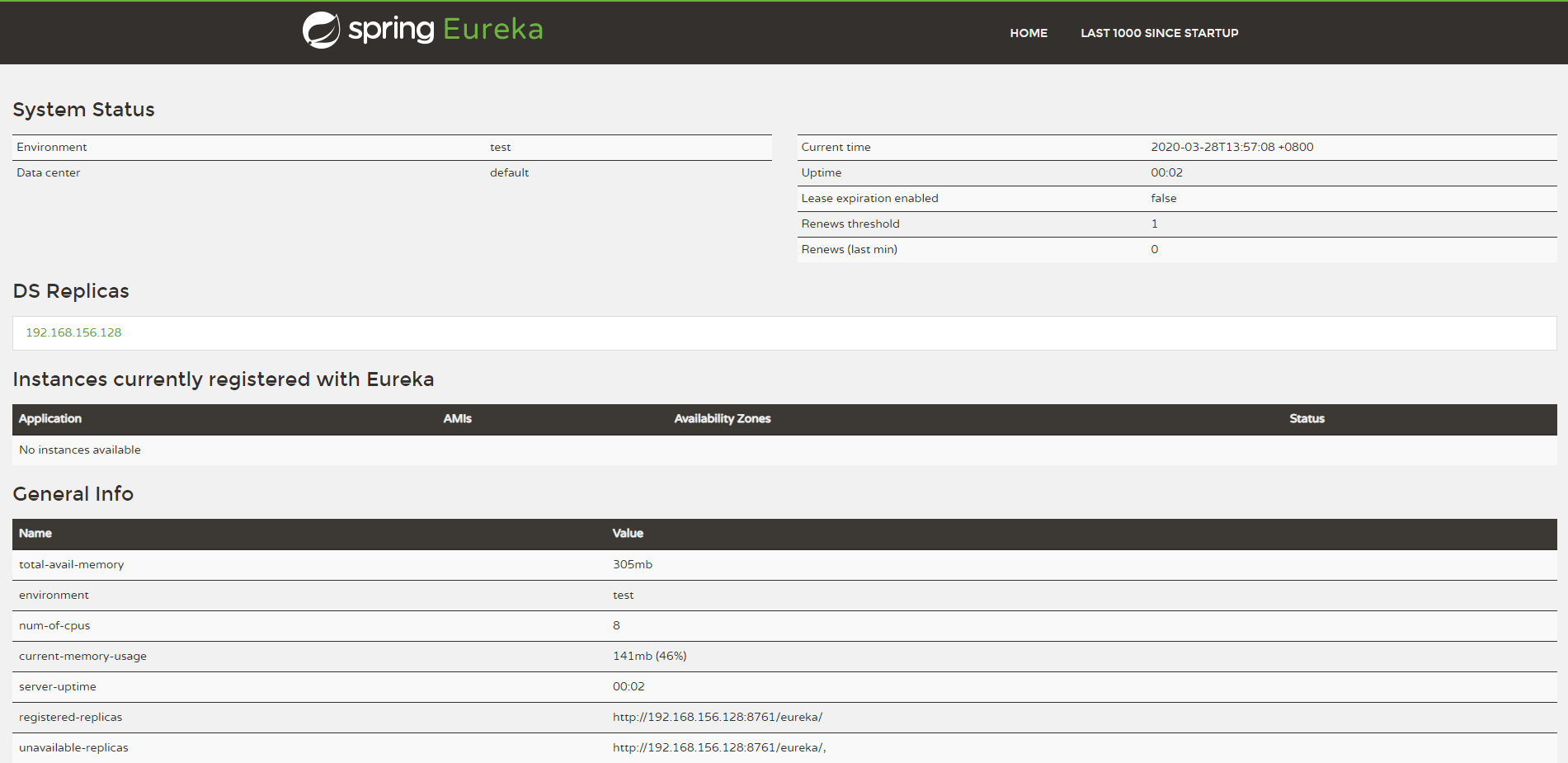 1 2 3 4 5 6 7 8 9 10 11 12 13 14 15 server: port: 8761 eureka: instance: hostname: eureka-server client: register-with-eureka: false fetch-registry: false service-url: defaultZone: http://192.168.156.128:8761/eureka/