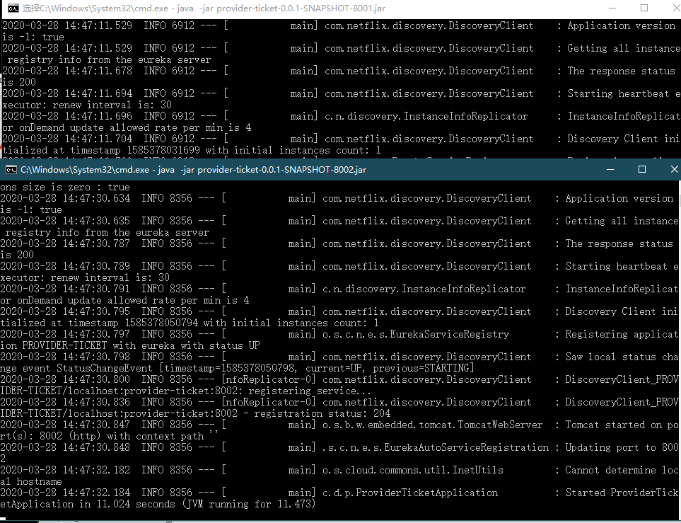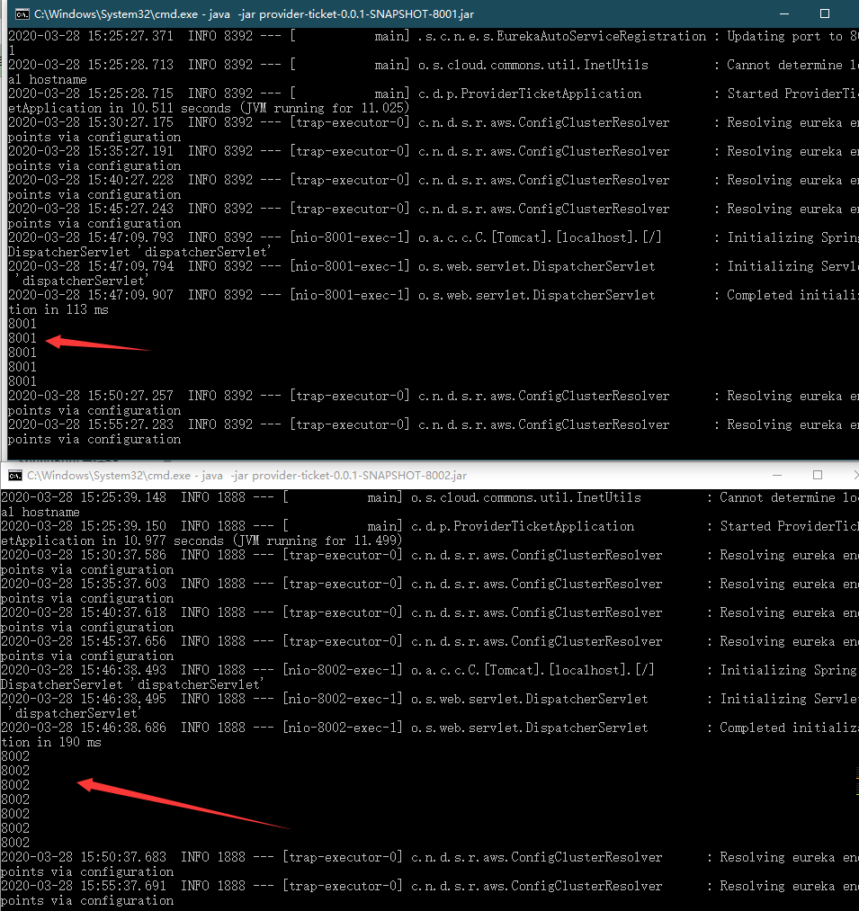 因为使用了负载均衡,查看 cmd 启动的 provider- ticket