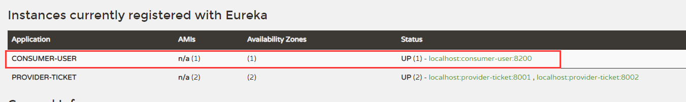 1 2 3 4 5 6 7 8 9 10 11 12 13 spring: application: name: consumer-user server: port: 8200 eureka: instance: prefer-ip-address: true client: service-url: defaultZone: http://localhost:8761/eureka/